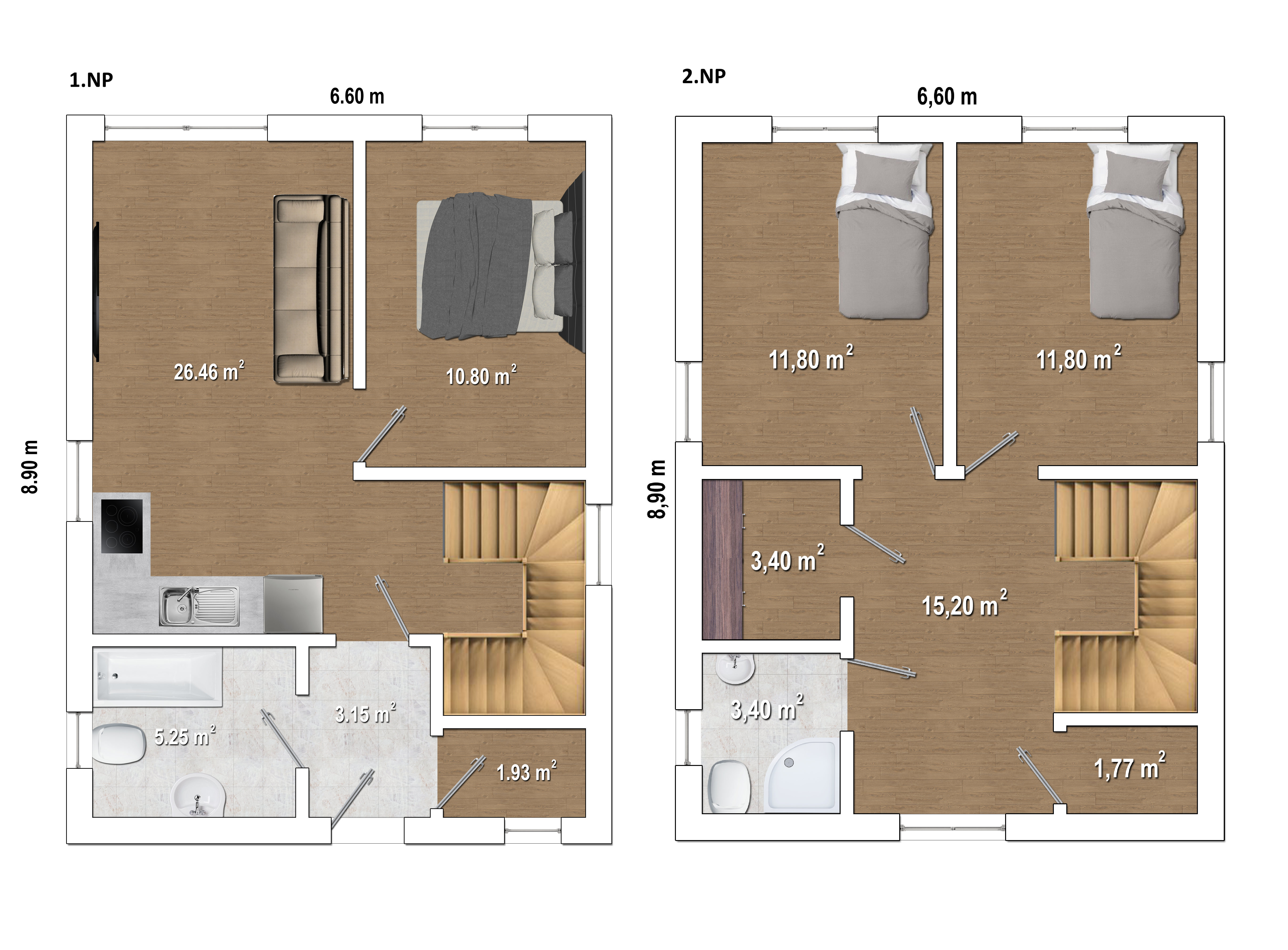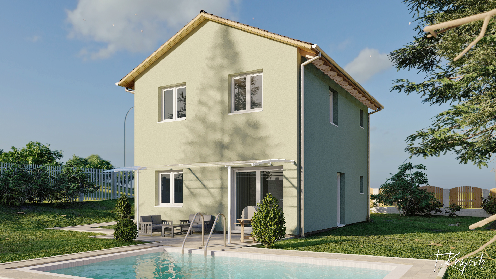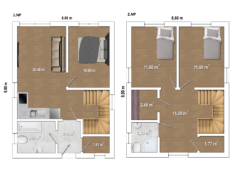 Moderní a prostorný dvoupatrový dům, který nabízí ložnici, dva pokoje pro Vaše ratolesti a útulný obývací pokoj. Součástí obývacího pokoje je kuchyňský kout. Tento dům lze realizovat se sedlovou či pultovou střechou.